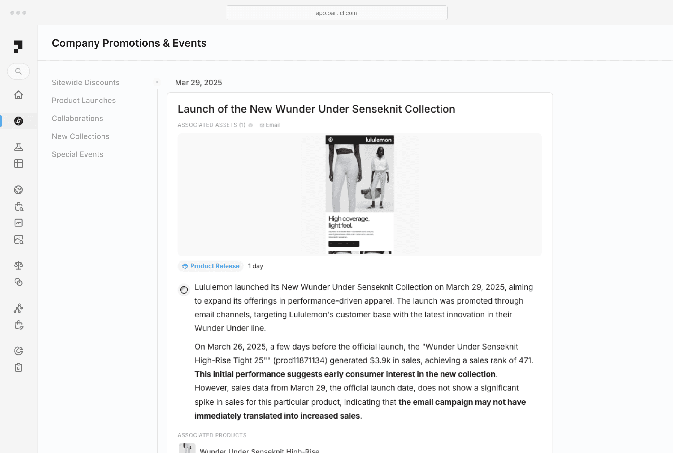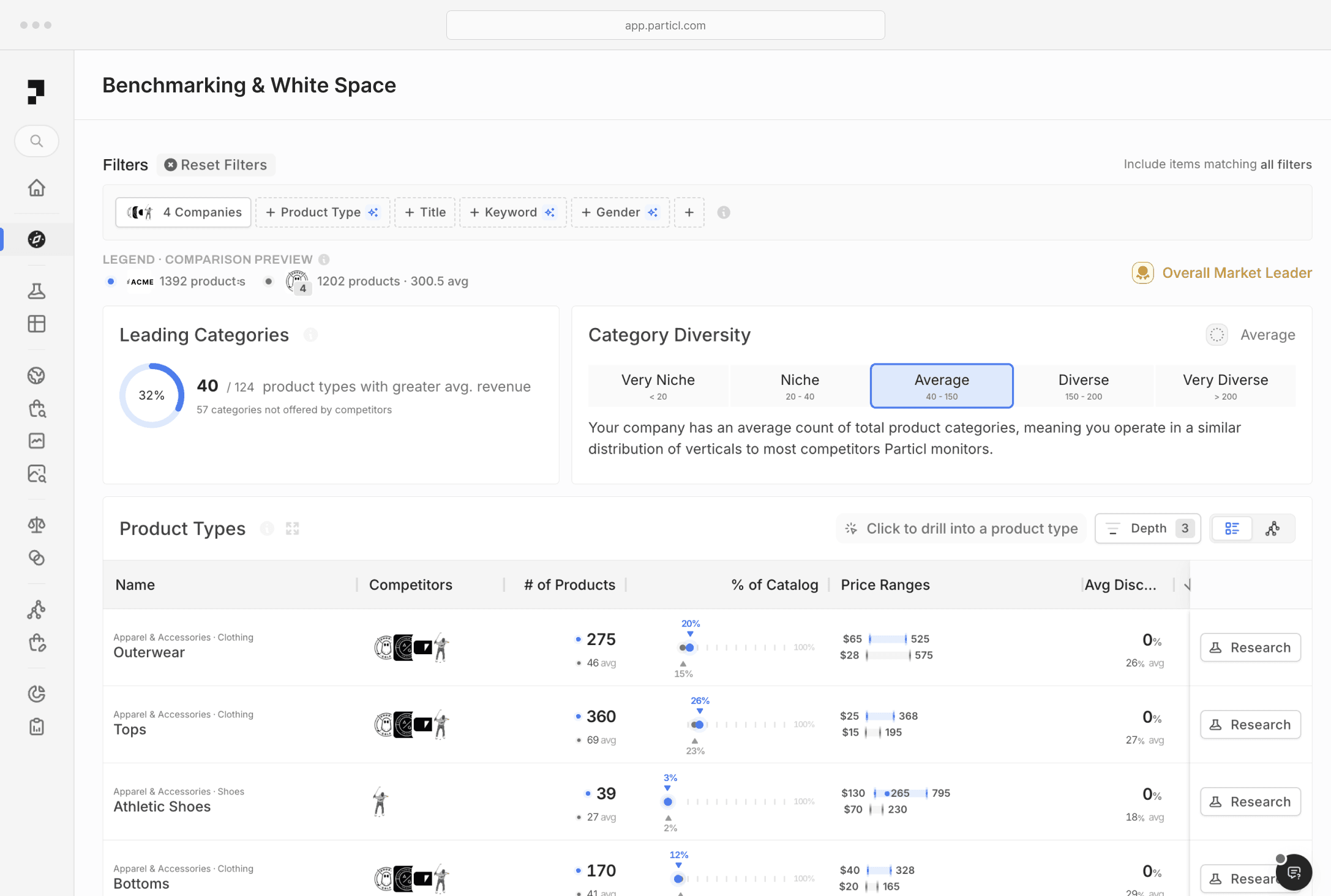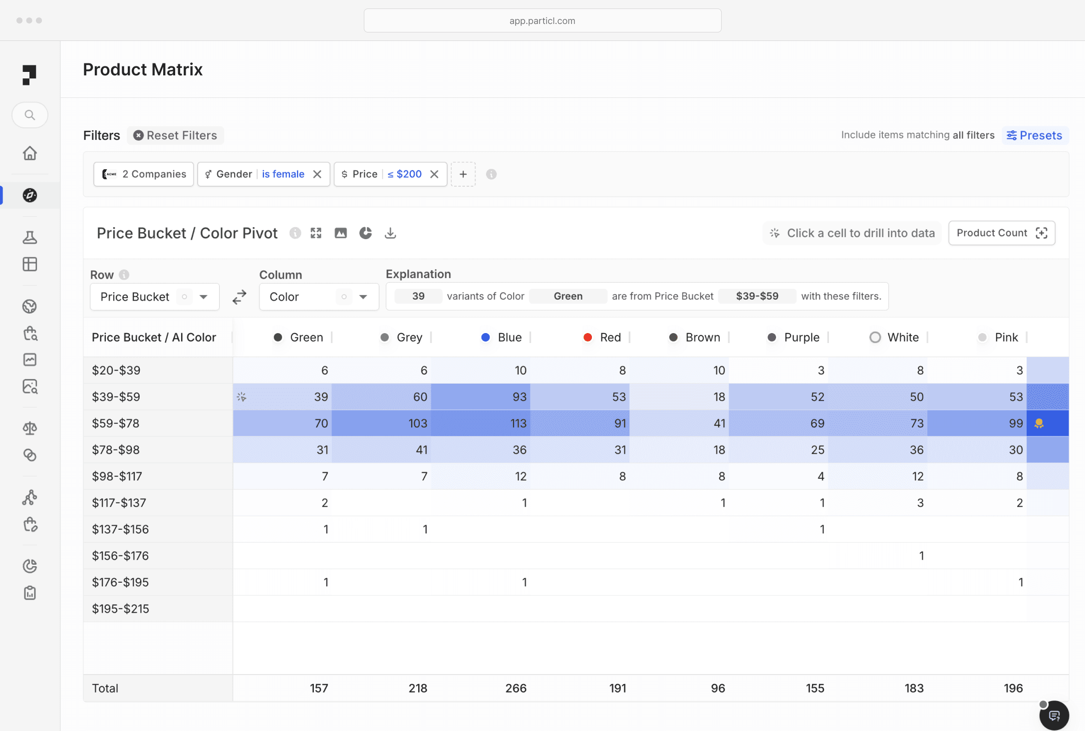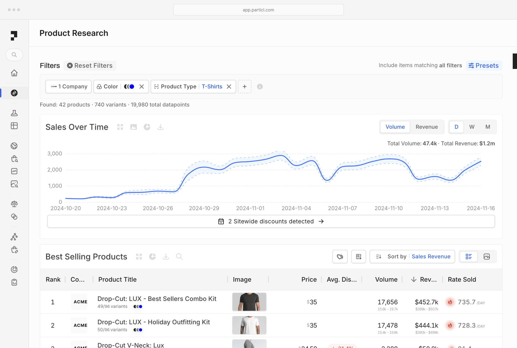 Particl AI tracks sales, inventory, pricing, assortment, and sentiment across all of e-commerce. Quickly identify profitable opportunities in the market.